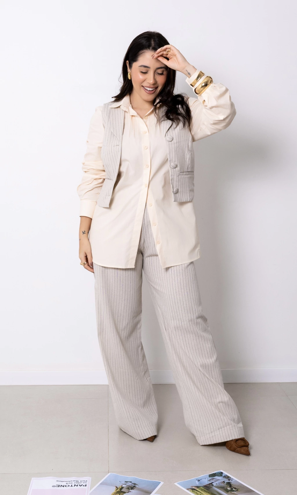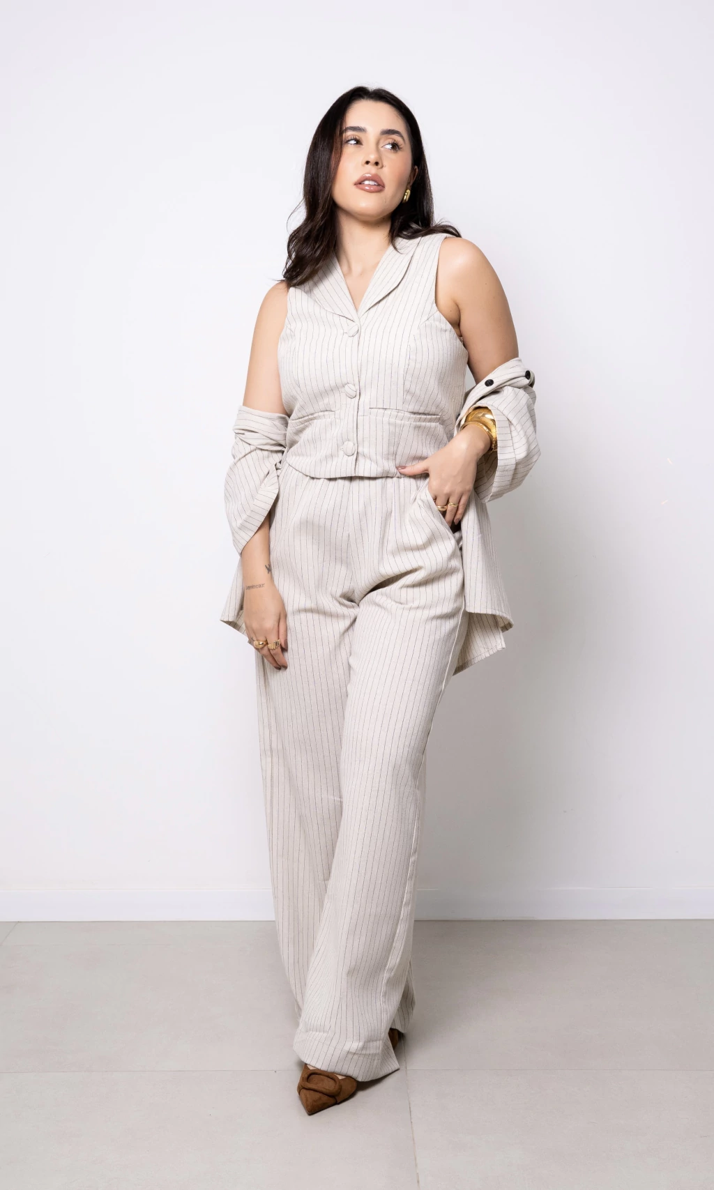 Descubra o Colete Florescer Risca Linho, a peça perfeita para quem busca um toque de sofisticação e frescor em qualquer ocasião. Confeccionado em linho premium, ele proporciona leveza e conforto ideais para o clima brasileiro, mantendo você elegante o dia todo.