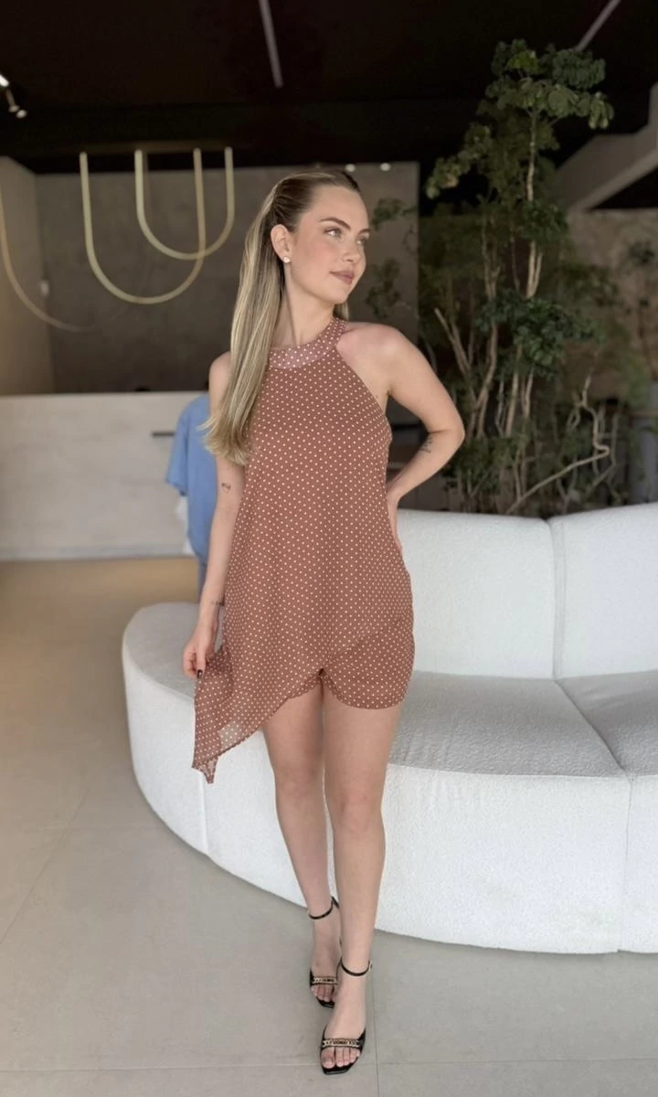 A blusa assimétrica traz um design único que destaca a feminilidade com sutileza, enquanto o short com elástico no cós oferece praticidade e ajuste perfeito, valorizando a silhueta com conforto. O clássico estampado de poá adiciona um charme atemporal, tornando esta combinação versátil para ocasiões desde encontros sociais até eventos mais casuais.