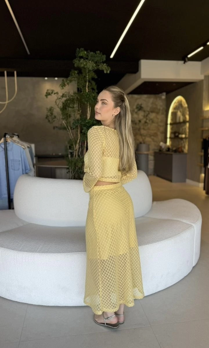 Conjunto composto por saia midi e cropped tela, uma peça exclusiva da coleção somar. Elegante, praiano e cheio de charme.