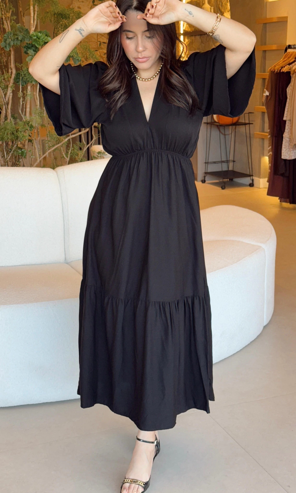 Confeccionado em viscolinho de alta qualidade, este vestido proporciona uma sensação suave e fresca, ideal para os dias quentes do Brasil. Seu design com mangas delicadas e decote em V valoriza a silhueta com um toque de charme discreto.